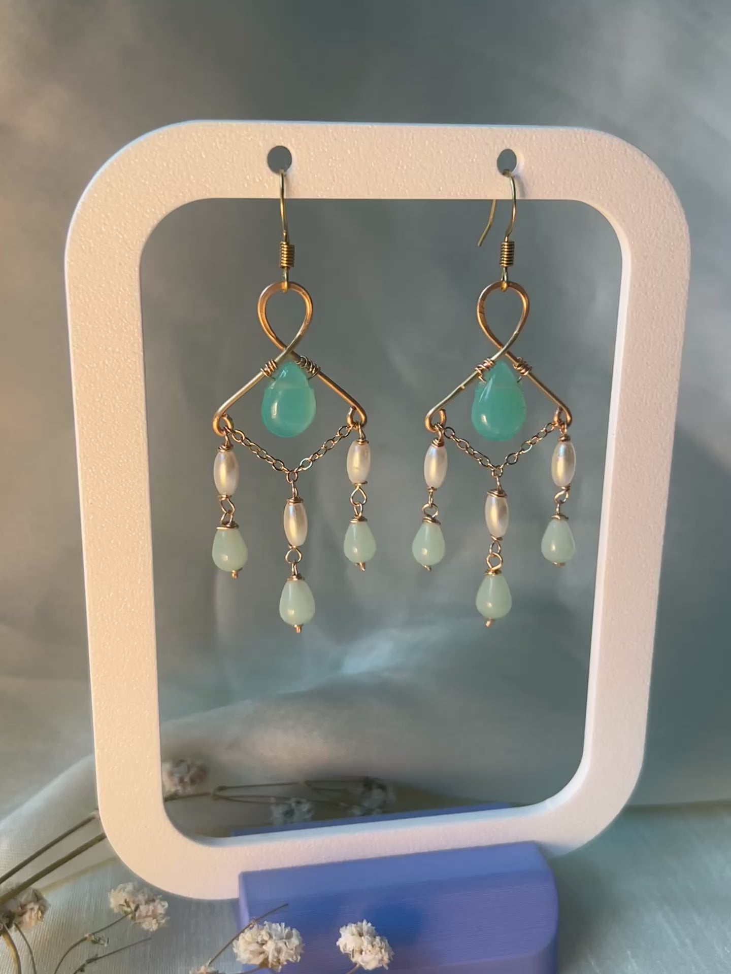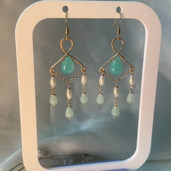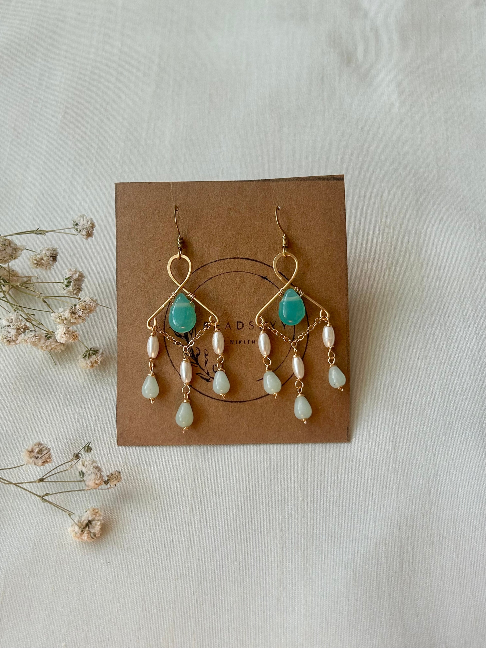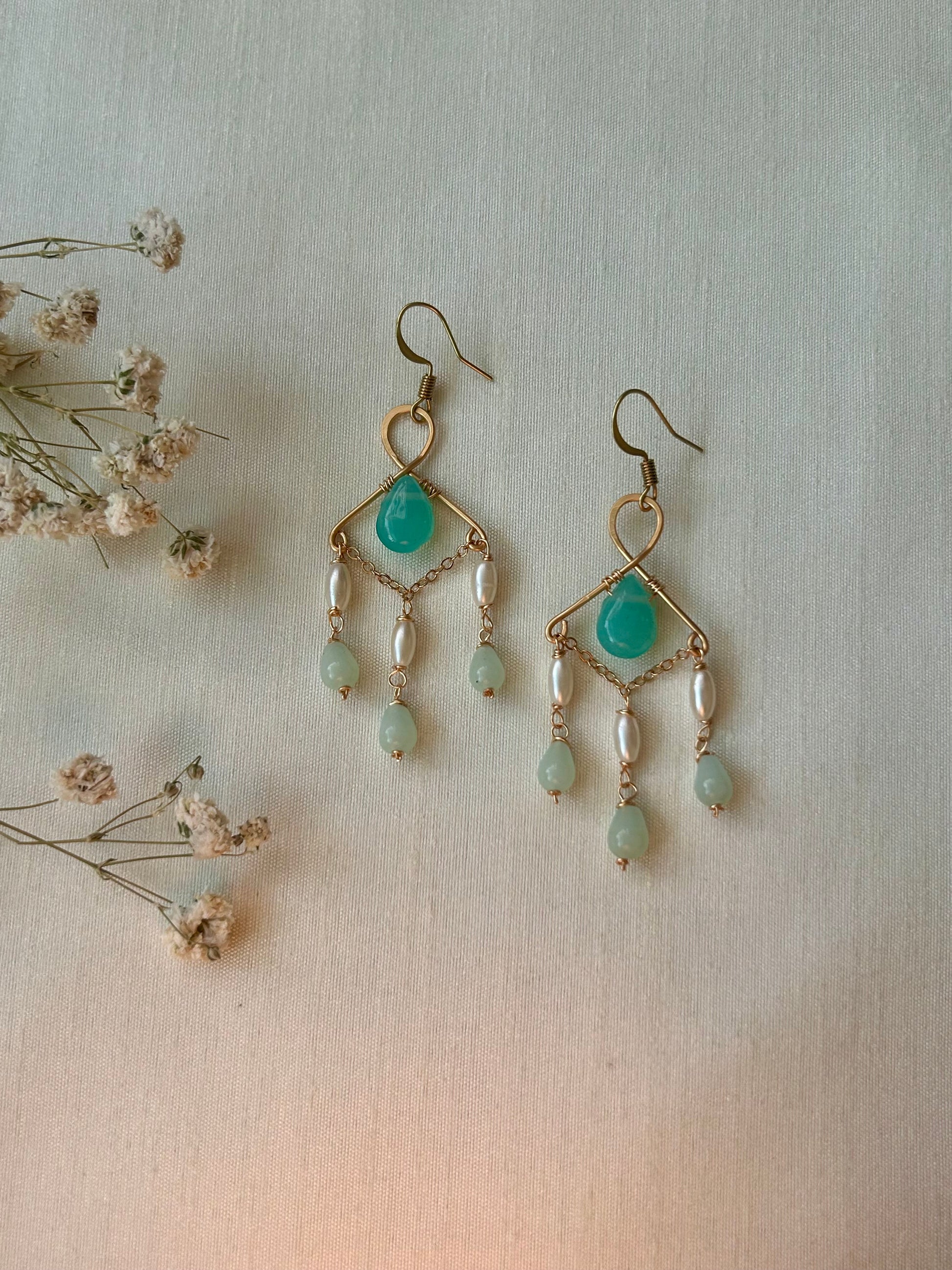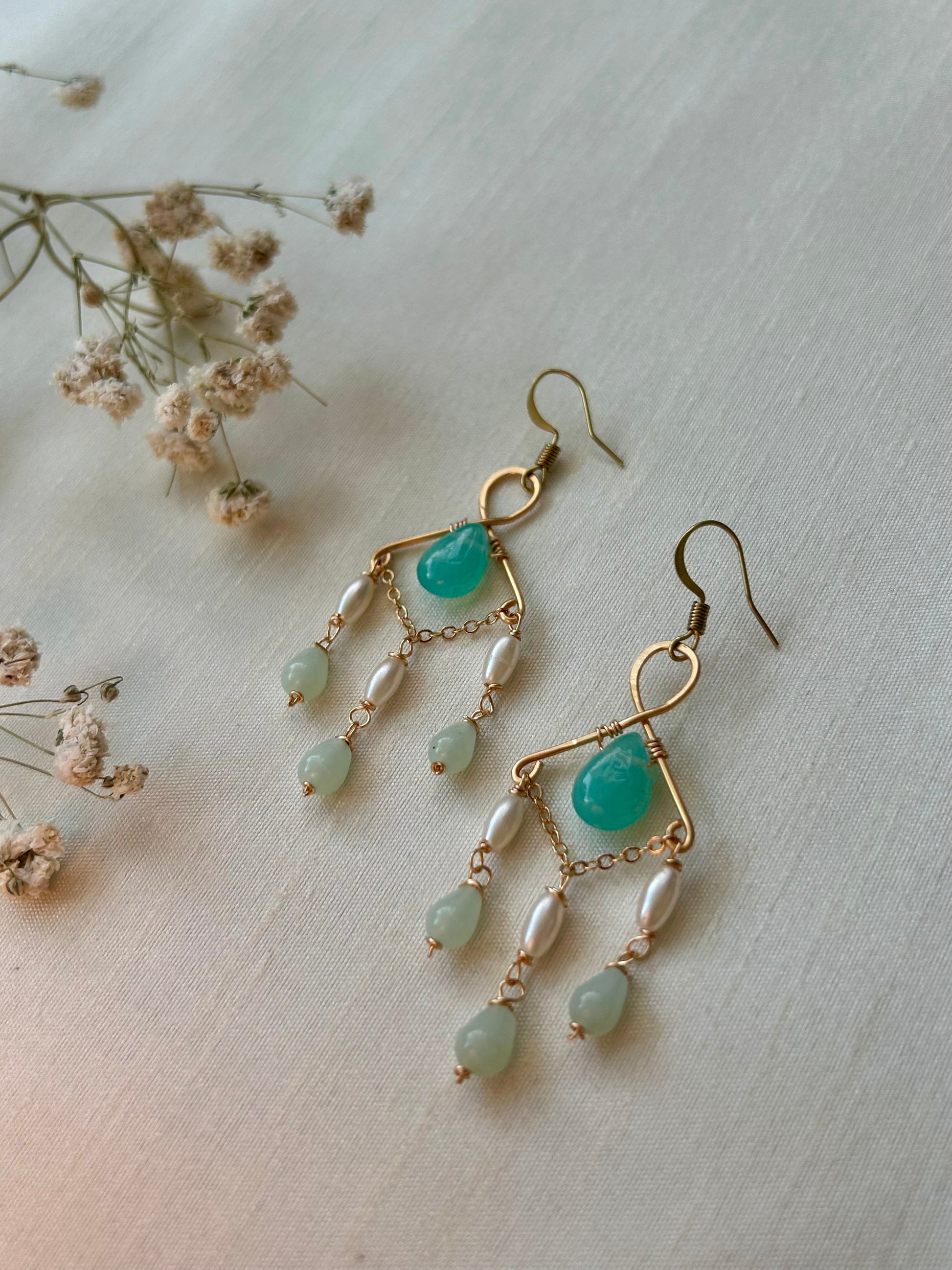 Elegant and graceful, these earrings feature soft aqua stones and delicate pearls wrapped in golden brass. Inspired by the calm beauty of the sea, Mira Drops add a serene touch of sophistication to any look. Perfect for both everyday wear and special occasions.