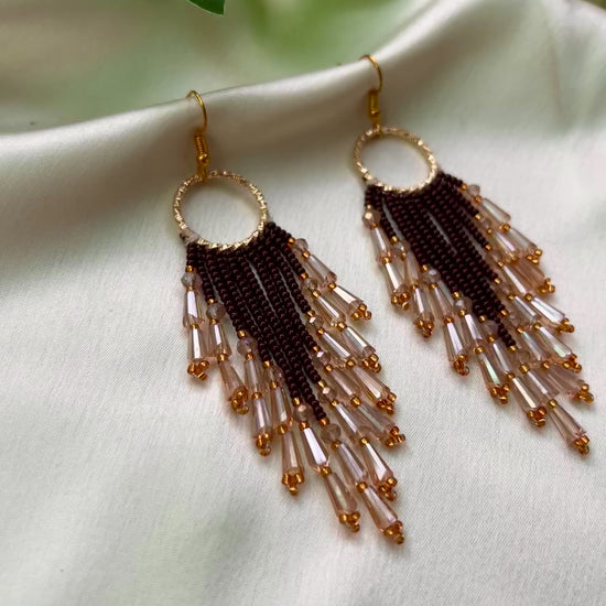 Where elegance meets earthiness — these handcrafted earrings feature rich mocha seed beads paired with shimmering champagne-gold bugle beads, all cascading from a textured golden hoop. The layered fringe design adds effortless flow and sparkle to every move. Despite their bold length, these earrings are super lightweight, making them perfect for long wear, whether it’s a brunch, date night, or celebration.